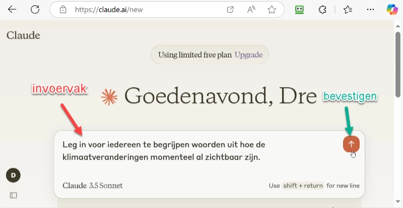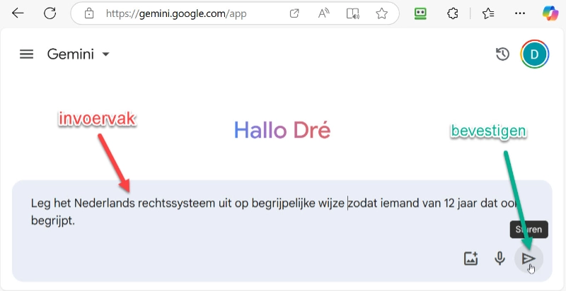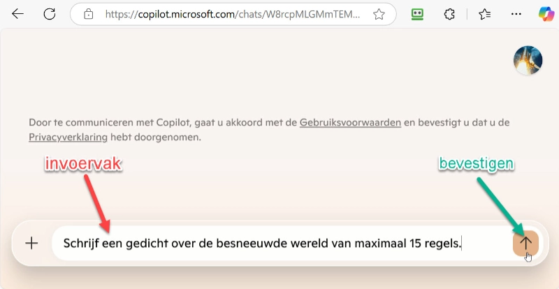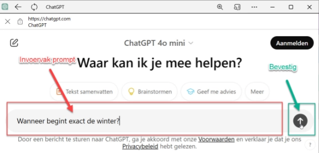 De afbeeldingen in dit artikel tonen telkens het vak van een chatbot waar je de prompt invoert en de knop waar je op moet klikken om de chatbot in actie te laten komen.